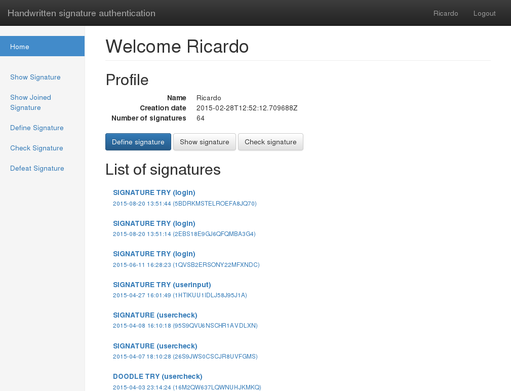 In the center, the user can see some info about himself and a list of signatures all associated with him.